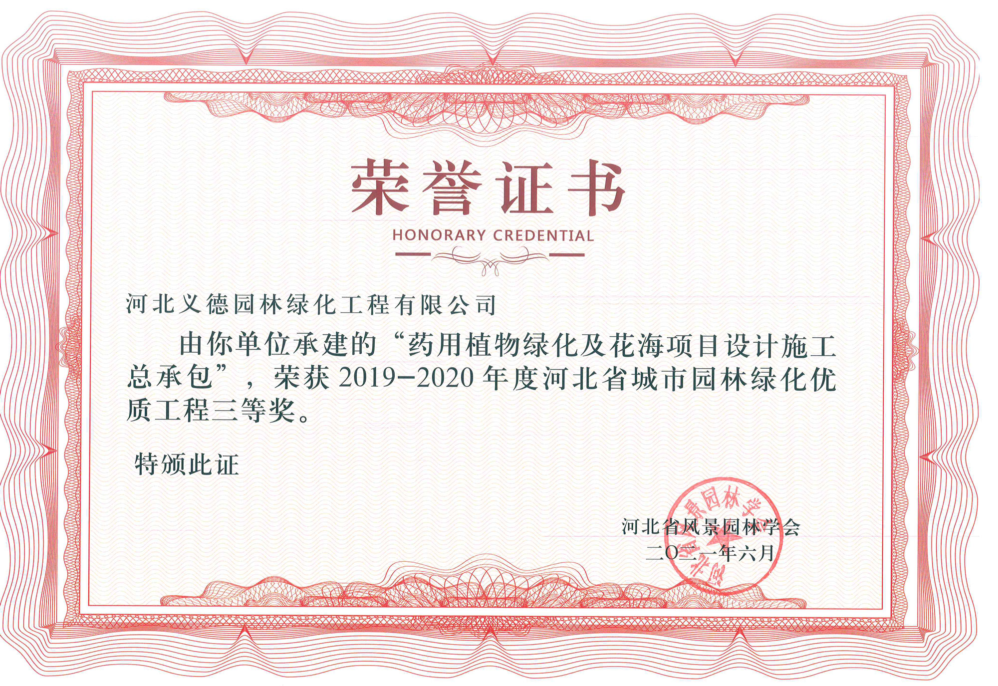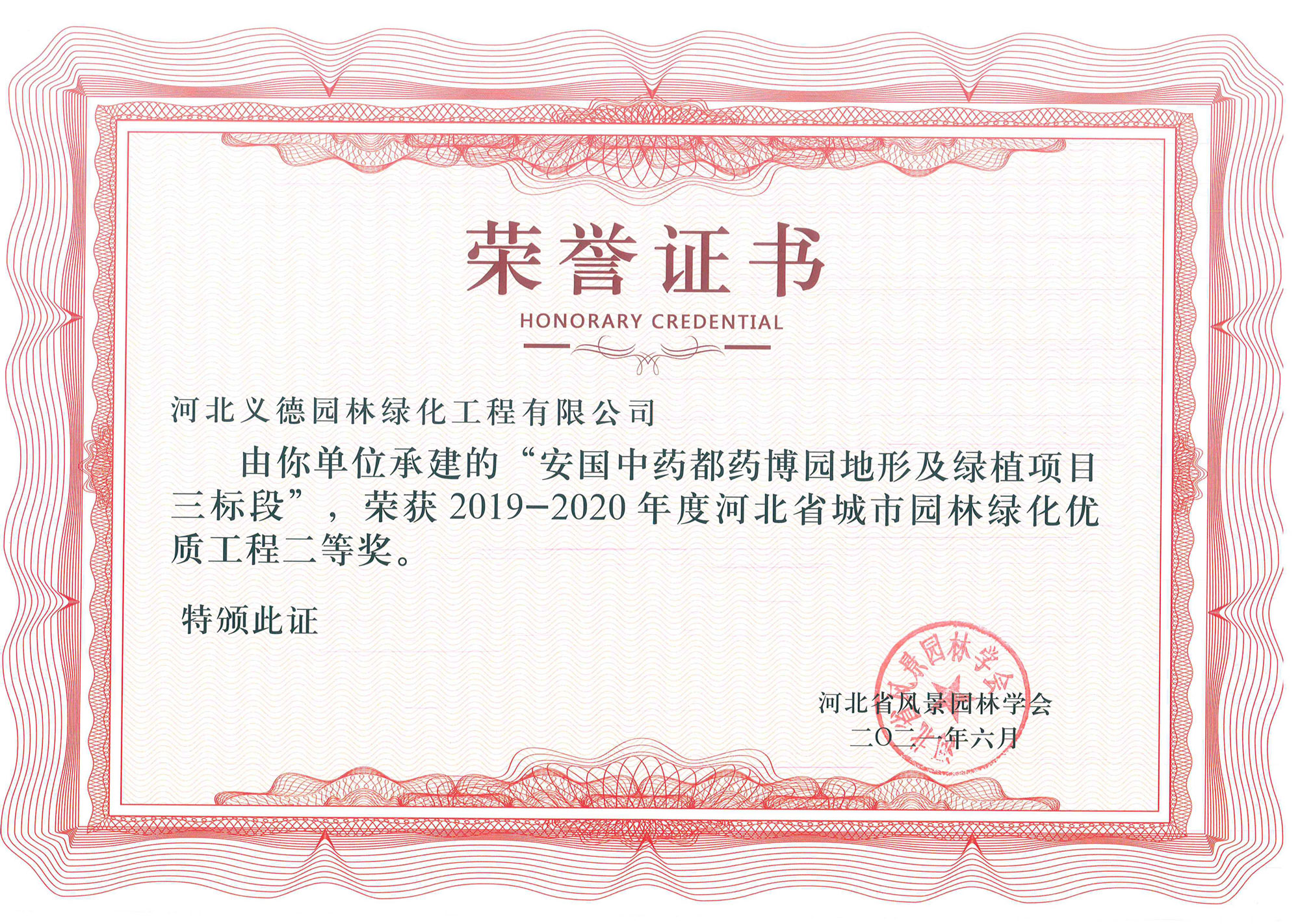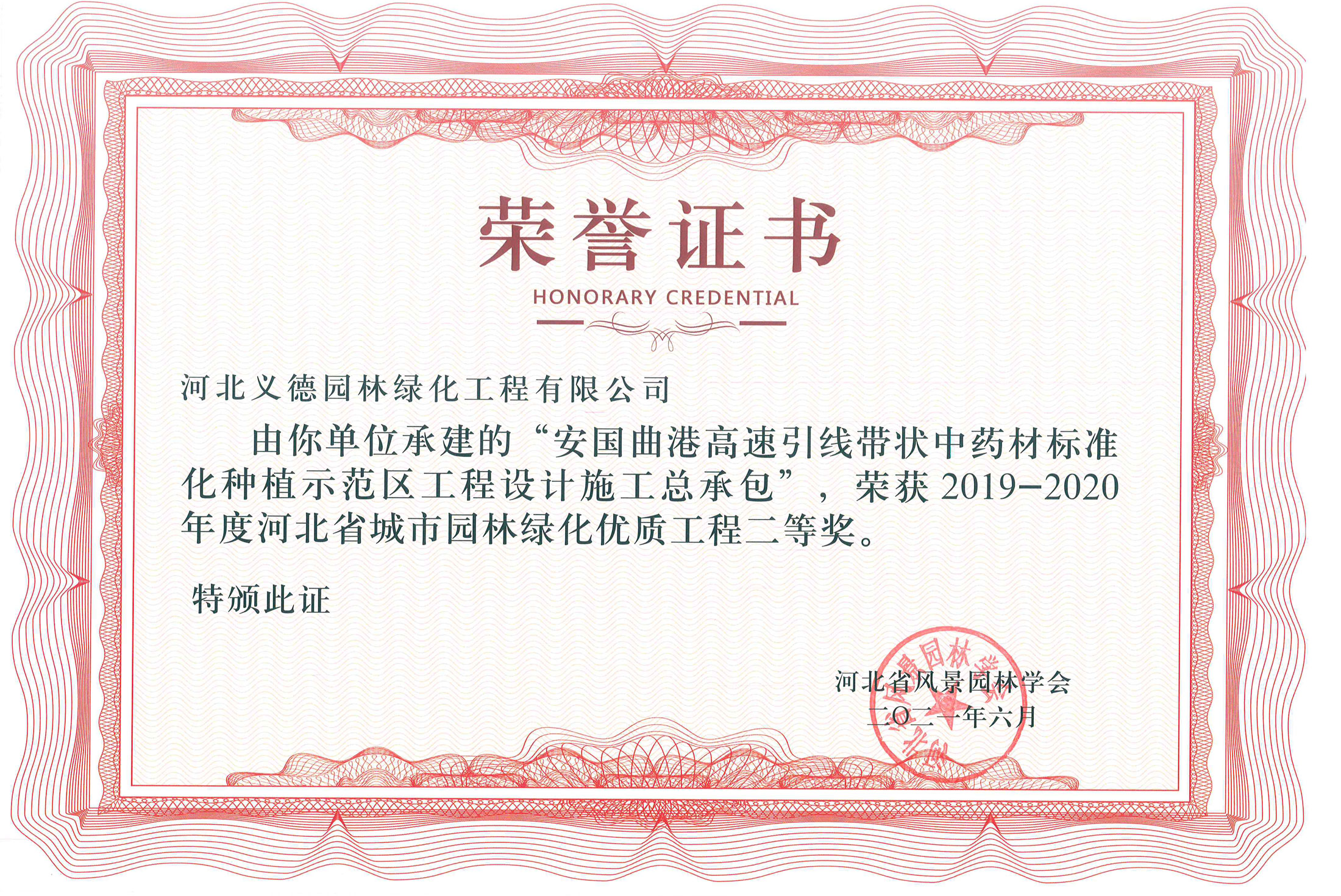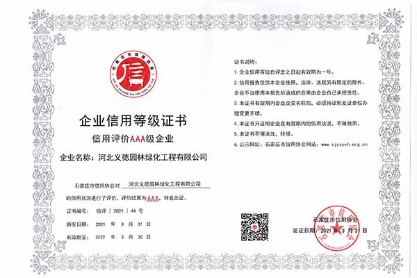 近幾年來我公司被授予2019年-2022年河北省扶貧龍頭企業(yè)、2018年國家林業(yè)標(biāo)準(zhǔn)化示范企業(yè)、2019年度全國苗圃50強、2018-2019年度河北省林業(yè)重點龍頭企業(yè)、2018年保定市精品特色現(xiàn)代農(nóng)業(yè)園區(qū)、2018年度保定林木種苗協(xié)會授予特色苗圃、2018年度北方十佳特色苗圃、2016-2019年河北省建設(shè)工程招標(biāo)投標(biāo)誠實守信5A級施工企業(yè)等榮譽稱號,2017年保定市林木種苗龍頭企業(yè)、石家莊市2017年度優(yōu)秀園林企業(yè)。